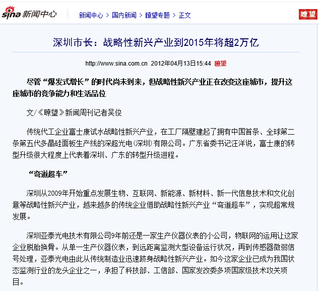 新浪網(wǎng):【深圳市長:戰(zhàn)略性新興產(chǎn)業(yè)到2015年將超2萬億】