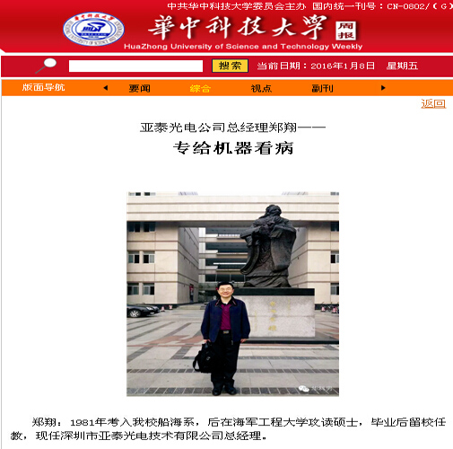 鄭翔:1981年考入華中科技大船海系,后在海軍工程大學攻讀碩士,畢業(yè)后留校任教,現(xiàn)任深圳市亞泰光電技術有限公司總經(jīng)理。