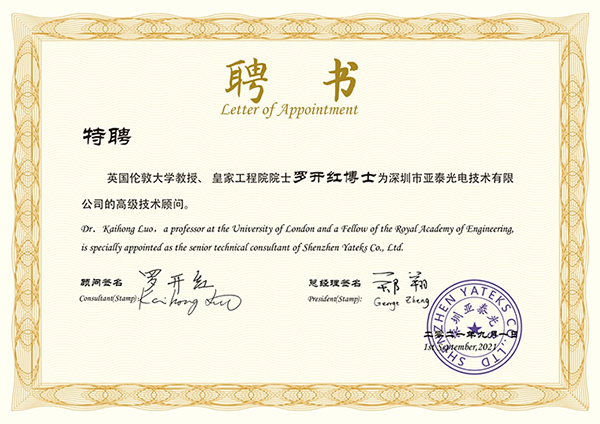 風勁帆滿海天闊,牽手闊步新征程!2021年9月1日,深圳市亞泰光電技術(shù)有限公司特聘英國倫敦大學教授、皇家工程院院士羅開紅博士為高級技術(shù)顧問。亞泰光電總經(jīng)理鄭翔為羅開紅博士頒發(fā)了聘書。