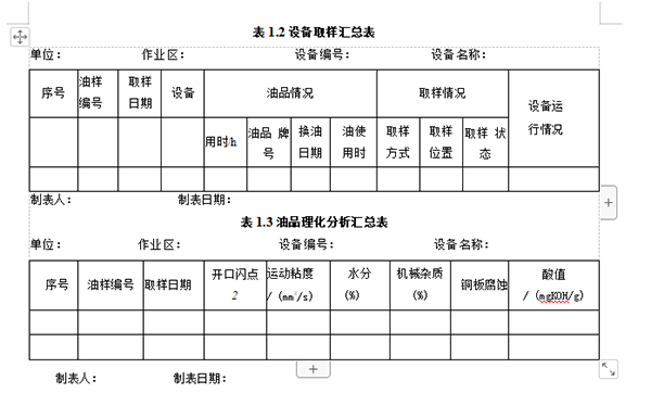 為了便于傳遞信息,對各類數(shù)據(jù)進行對比和匯總分析,需要生成各類報表, 以備分析需要選擇。生成的報表可包括:①油液報表,包括油樣明細表、單機 取樣記錄匯總表、油樣月度匯總表等;②油品理化分析報表,包括油樣分析結(jié) 果表、單機潤滑理化分析匯總表、單臺設(shè)備潤滑記錄表等;③鐵譜分析結(jié)果表, 包括磨粒成分匯總表、磨粒濃度數(shù)據(jù)匯總表、鐵譜分析記錄表等;④油液監(jiān)測 結(jié)論表等。下面給出了 “設(shè)備取樣匯總表”和“油品理化分析匯總表”的樣表, 見表1.1和表1.3。
