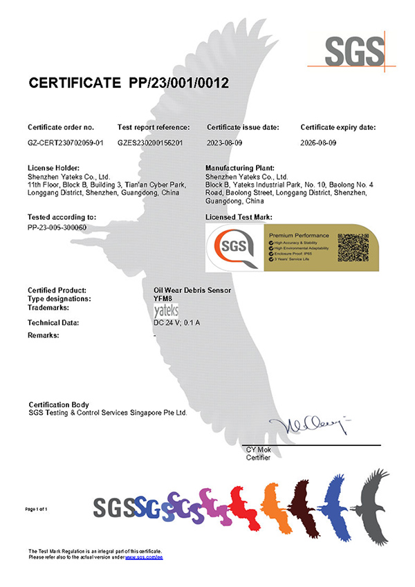 亞泰光電油液金屬磨粒傳感器通過(guò)了SGS嚴(yán)格的高低溫、濕熱循環(huán)、沖擊振動(dòng)、包裝跌落等環(huán)境類(lèi)測(cè)試,以及包括EMC和安全性在內(nèi)的法規(guī)類(lèi)測(cè)試。經(jīng)測(cè)試驗(yàn)證,傳感器的壽命和功能性符合宣稱(chēng),最終取得了SGS頒發(fā)的首張傳感器性能認(rèn)證(Sensor Trust)項(xiàng)目Premium Performance證書(shū)。