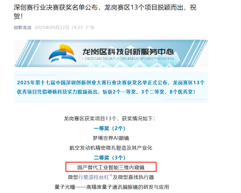 這一榮譽來之不易。就在9月22日,亞泰光電的“國產(chǎn)替代工業(yè)智能三維內(nèi)窺鏡”項目剛在深創(chuàng)賽中斬獲亞軍,順利拿到了進(jìn)軍全國賽的“入場券”。此次在全國賽中再度獲獎,實現(xiàn)了從地方到國家的技術(shù)實力認(rèn)證雙跨越。