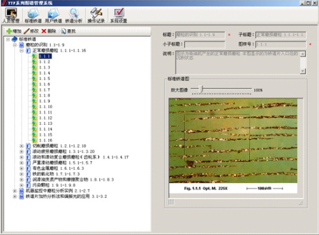 軟件包含:?員管理,標準鐵譜管理,??鐵譜管理,鐵譜分析,操作記錄管理.系統(tǒng)設(shè)置6個部分??梢詫﹁F譜圖?進?實時的采集、 對?、測距、分析完畢可以把分析結(jié)果保存,并且以報表的形式打印出來或者保存為PDF?件。