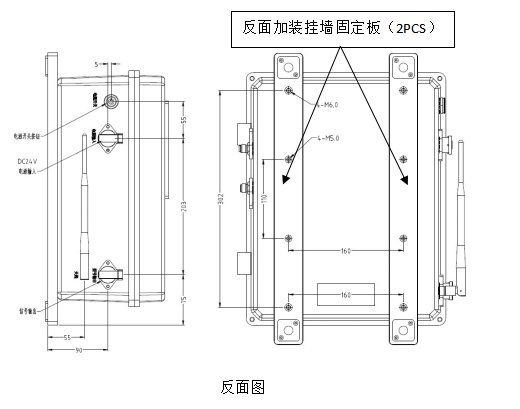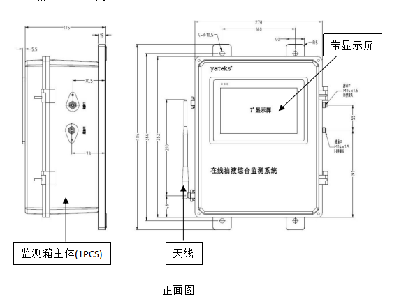 監(jiān)測(cè)箱內(nèi)部結(jié)構(gòu)組成:磨粒傳感器+清潔度傳感器+含水率傳感器+粘度傳感器+微量水傳感器+介電常數(shù)等,用戶可根據(jù)不同需求進(jìn)行功能選配。監(jiān)測(cè)箱外觀結(jié)構(gòu)組成:監(jiān)測(cè)箱主體(1PCS)+掛墻固定板(2PCS)+天線。