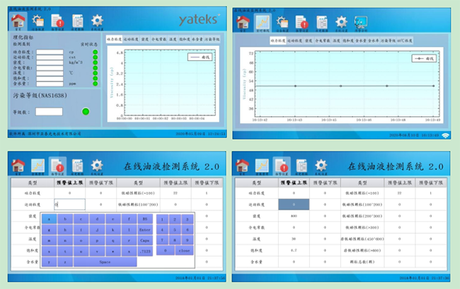 &, nbsp; 依照用戶選擇實(shí)時(shí)監(jiān)測(cè)油液的各種理化性質(zhì),如動(dòng)力粘度、運(yùn)動(dòng)粘度、密度、介電常數(shù)、溫度、飽和度、含水量、含水率、污染等級(jí)、金屬磨屑,用曲線圖規(guī)律性分析,并記錄保存,以給用戶對(duì)油液的狀態(tài)提供一個(gè)導(dǎo)向性的參考。